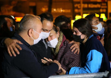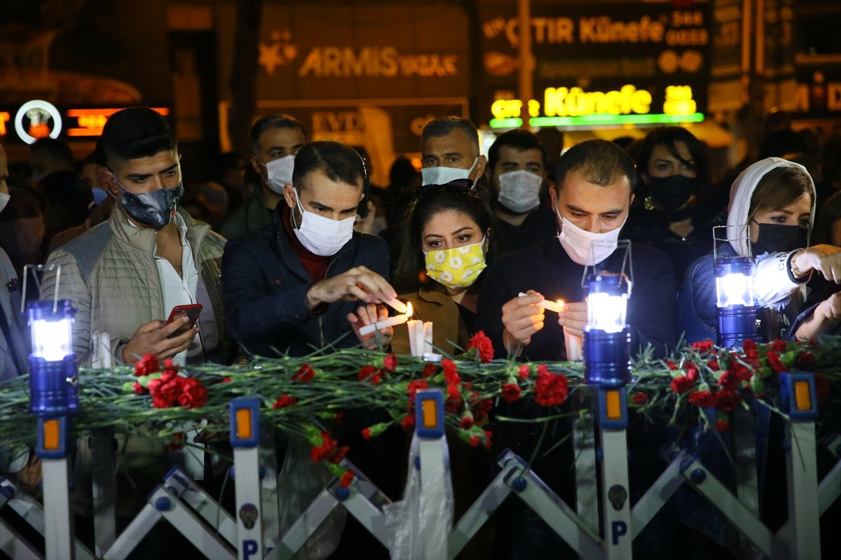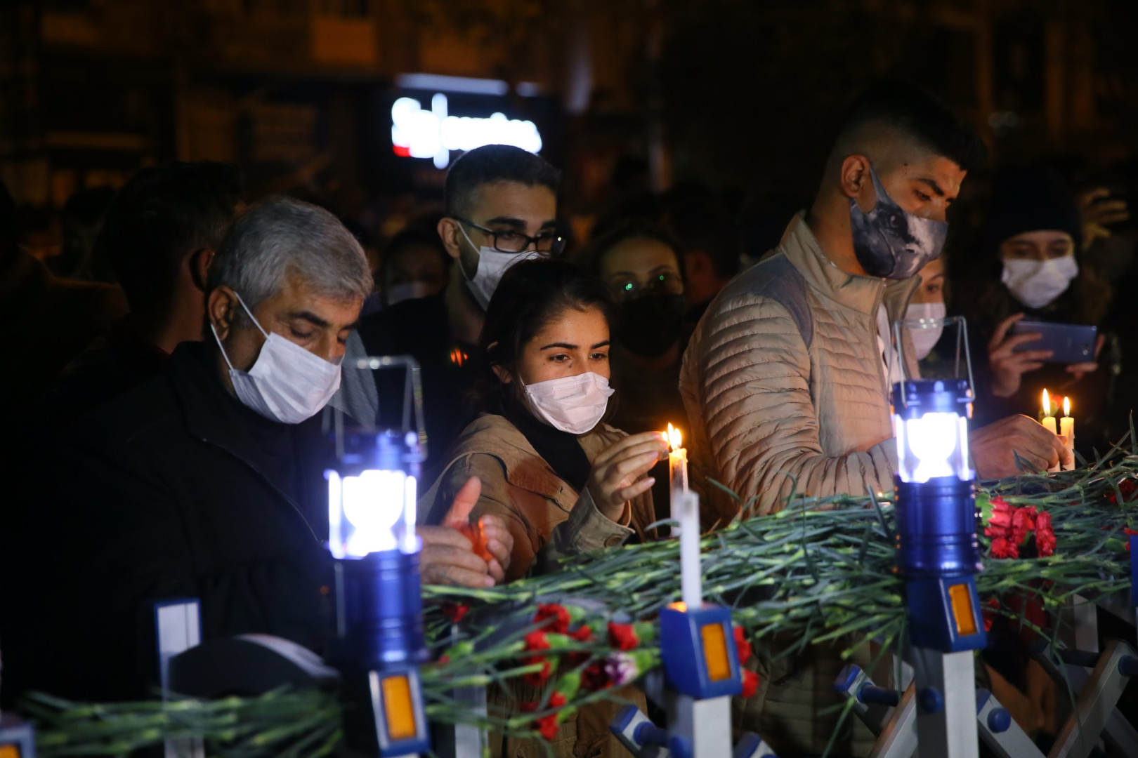 Karanfillerin bırakıldığı bu bölgede mumlar yakıldı. Yıkılan apartman önüne gelen ölenlerin yakınları gözyaşlarına boğuldu.