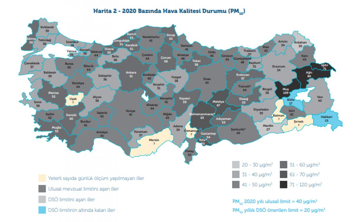 Muş, Iğdır, İstanbul, Sinop, Malatya, Edirne, Tokat, Kayseri, Denizli, Düzce, Karabük, Ağrı ve Ankara'daki 15 istasyonda 2020 boyunca yapılan ölçümlerde "yüksek hava kirliliği" gözlenirken, Türkiye'de sadece Bitlis ve Hakkari'de hava kirliliği (PM10) DSÖ'nün kılavuz değerlerinin altında ölçüldü.