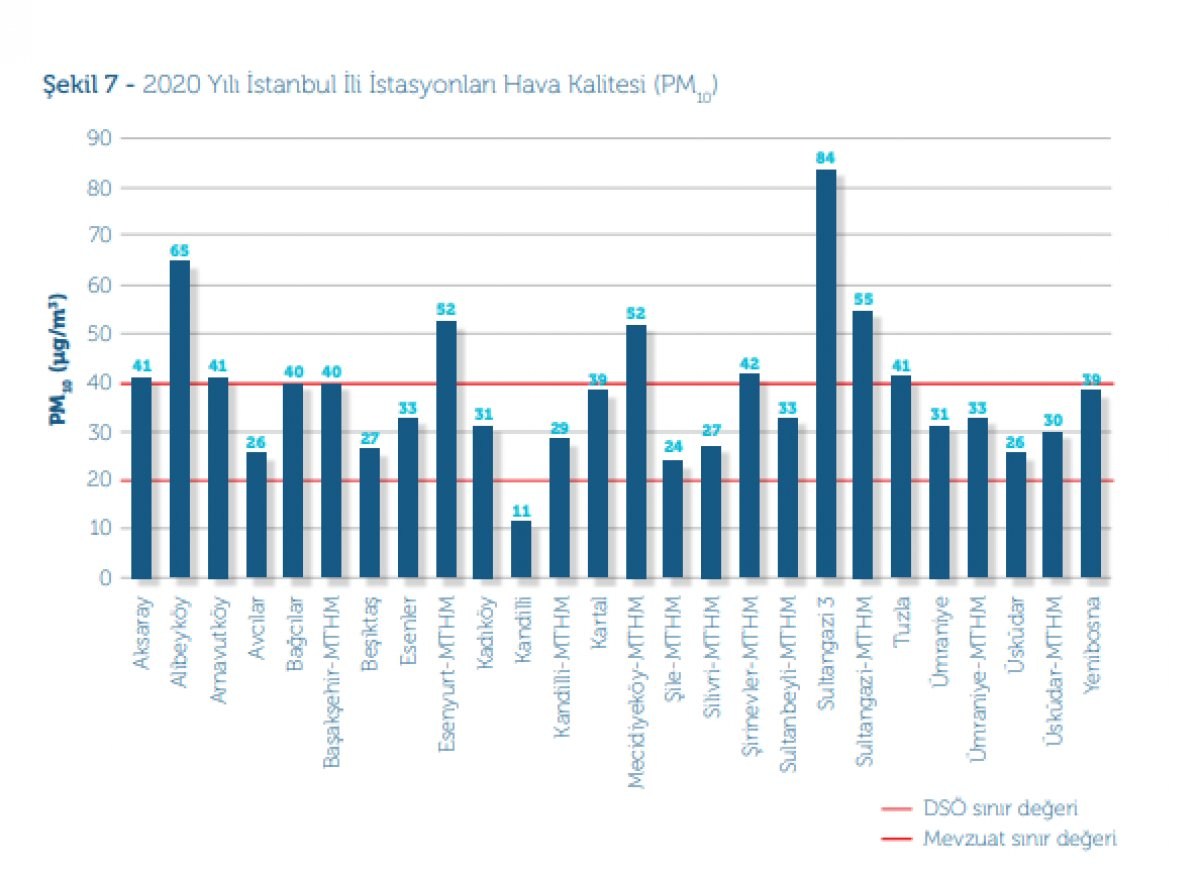 Rapor, 2020'de İstanbul'da PM10 ortalamasının önceki yıllara göre daha düşük seviyelerde kaldığını ancak bu seviyenin bile DSÖ'nün önerdiği kılavuz değerlerin iki katı olduğunu ortaya koydu.