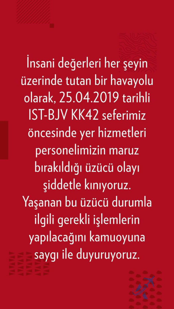 "Çelebi Hava Servisi AŞ'de görevli çalışanımız, bir yolcudan ağır hakaretlere uğramıştır. Saygı çerçevesi dışına çıkılan bu durumu şiddetle kınıyoruz. Şirketimiz, söz konusu yolcuya karşı ilgili hukuki işlemleri başlatmıştır" ifadeleri kullanıldı.